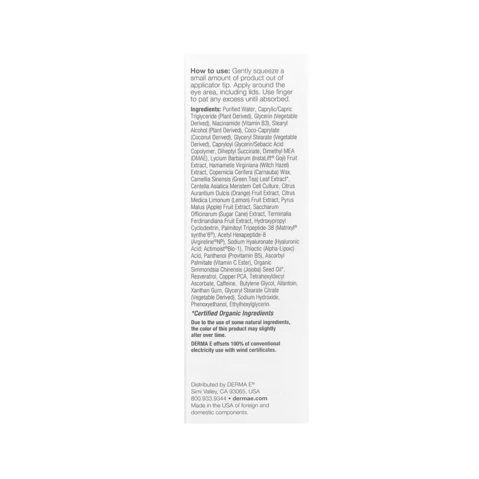 Purified Water, Caprylic/Capric Triglyceride (Plant Derived), Glycerin (Vegetable Derived), Niacinamide (Vitamin B3), Stearyl Alcohol (Plant Derived), Coco-Caprylate (Coconut Derived), Glyceryl Stearate (Vegetable Derived), Capryloyl Glycerin/Sebacic Acid Copolymer, Diheptyl Succinate, Dimethyl MEA (DMAE), Lycium Barbarum (InstaLift® Goji) Fruit Extract, Hamamelis Virginiana (Witch Hazel) Extract, Copernicia Cerifera (Carnauba) Wax, Camellia Sinensis (Green Tea) Leaf Extract*, Centella Asiatica Meristem Cell Culture, Citrus Aurantium Dulcis (Orange) Fruit Extract, Citrus Medica Limonum (Lemon) Fruit Extract, Pyrus Malus (Apple) Fruit Extract, Saccharum Officinarum (Sugar Cane) Extract, Terminalia Ferdinandiana Fruit Extract, Hydroxypropyl Cyclodextrin, Palmitoyl Tripeptide-38 (Matrixyl® synthe'6®), Acetyl Hexapeptide-8 (Argireline®NP), Sodium Hyaluronate (Hyaluronic Acid; Actimoist®Bio-1), Thioctic (Alpha-Lipoic) Acid, Panthenol (Provitamin B5), Ascorbyl Palmitate (Vitamin C Ester), Organic Simmondsia Chinensis (Jojoba) Seed Oil*, Resveratrol, Copper PCA, Tetrahexyldecyl Ascorbate, Caffeine, Butylene Glycol, Allantoin, Xanthan Gum, Glyceryl Stearate Citrate (Vegetable Derived), Sodium Hydroxide, Phenoxyethanol, Ethylhexylglycerin.