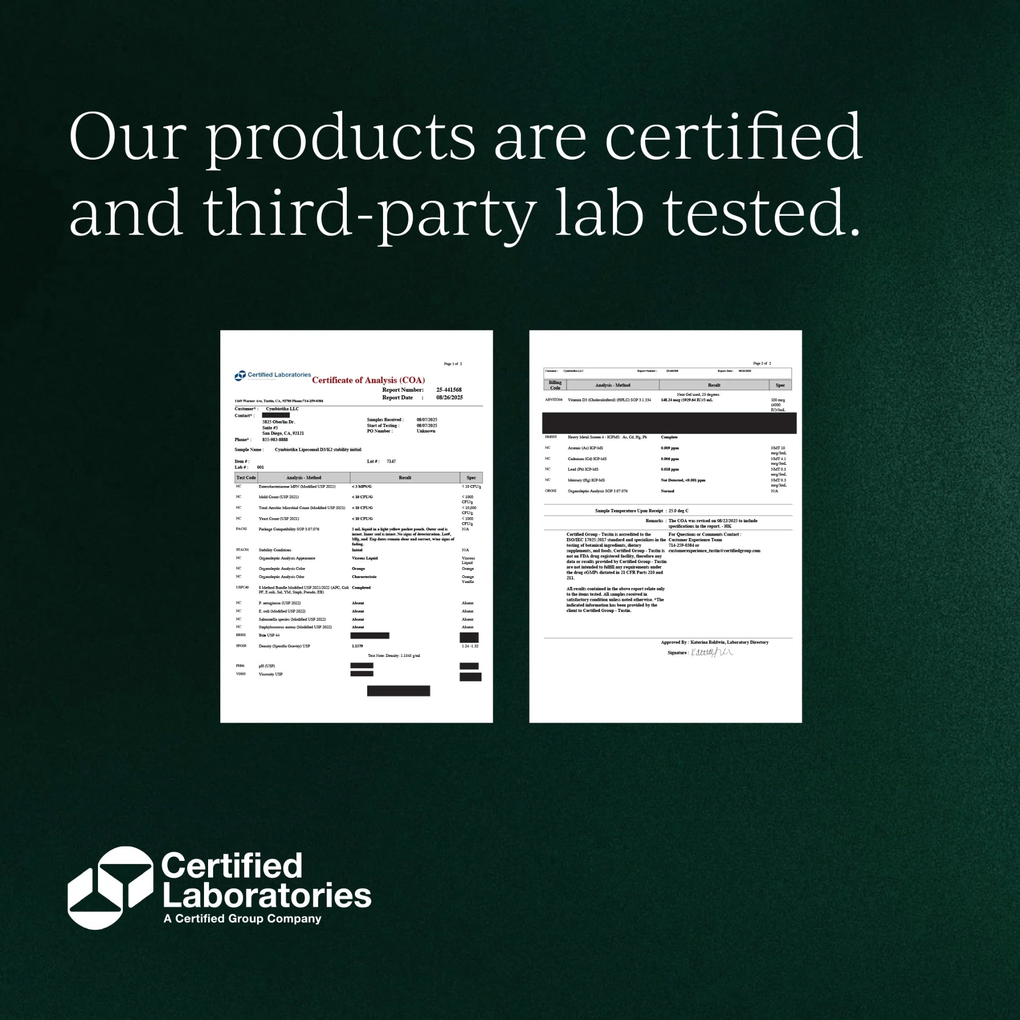Tested for purity and safety by Certified Labs. Verified absence of harmful bacteria, heavy metals, and contaminants. Product meets all quality standards, with clear labeling and stability checks for your peace of mind.